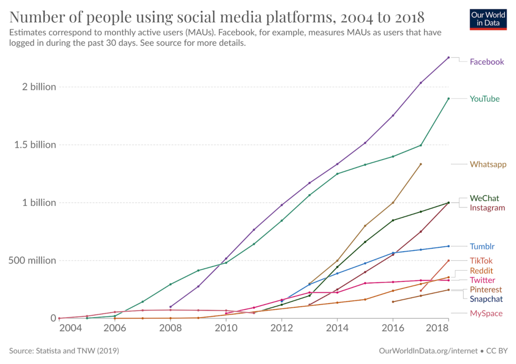 Figure 1: Number of people using social media platforms, 2004 to 2018