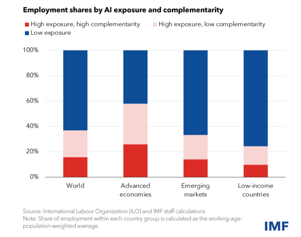 Most jobs are exposed to AI in advanced economies, with smaller shares in emerging markets and low-income countries.